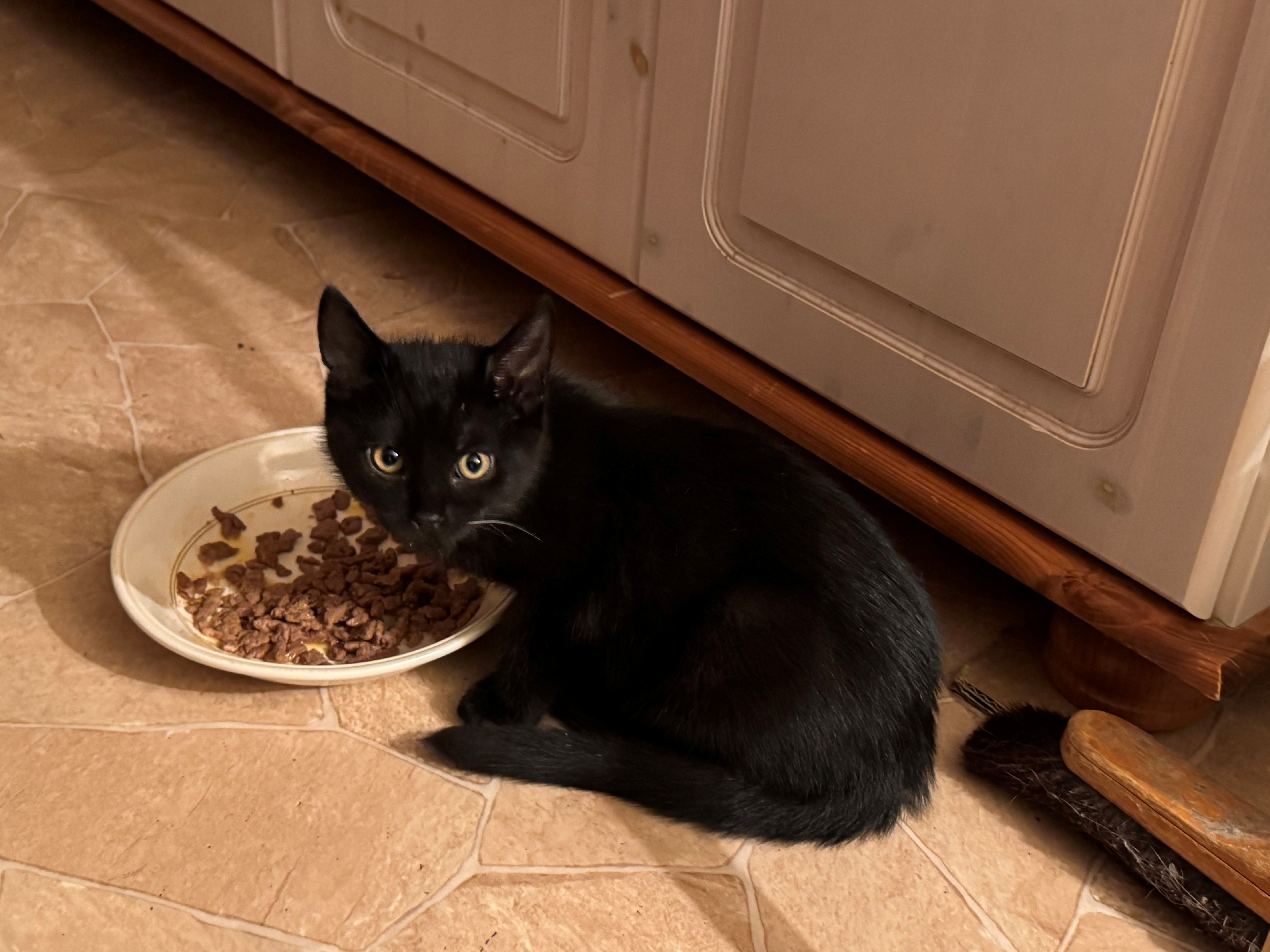 Blacky, geboren ca. Mitte August 2025, ist aufgeweckt, verspielt und genießt die Streicheleinheiten. Er kennt andere Katzen und Hunde.
