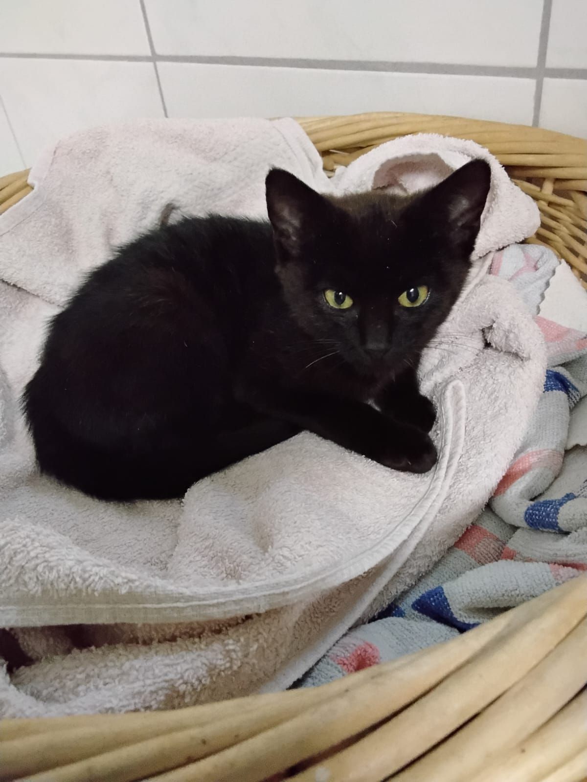 Immo, geboren ca. Juni 2025, hat sich auf der Pflegestelle schnell an Menschen gewöhnt und lässt sich auf dem Arm nehmen sowie streicheln.